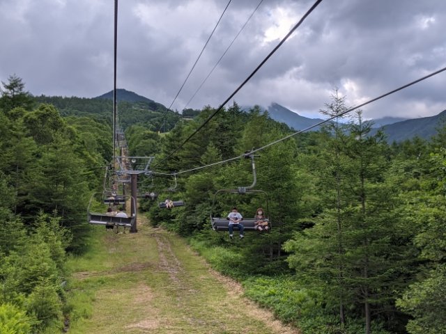 山頂にあるため、パノラマリフトに乗車します。料金は往復1,800円。雪山以外で乗るリフトはとっても新鮮な気分。