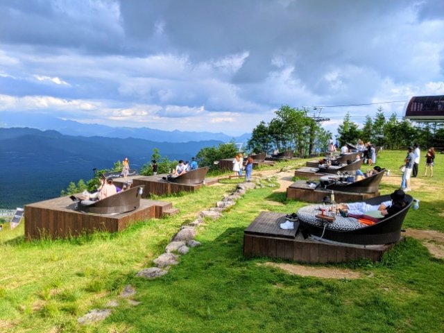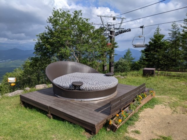 リフトを降りるとすぐに目に入るのは、オープンなロケーションにずらりと並ぶソファ。これぞ清里テラス!といった風景で気分が高まります!