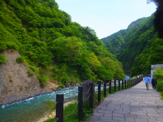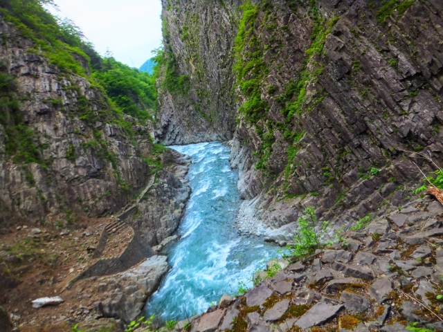 しばらくは渓谷沿いの遊歩道を進みます。左手に流れるのは信濃川の支流のひとつである清津川。水の色がブルーでとってもキレイです。