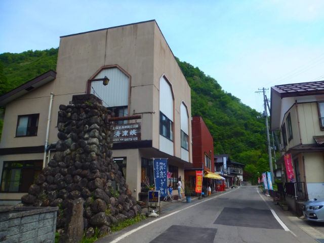 駐車場に車を停めて進むと、すぐに耳に入る水の音。お土産や食事処の並ぶ小さな温泉街「清津峡小出温泉街」を通り抜けていきます。