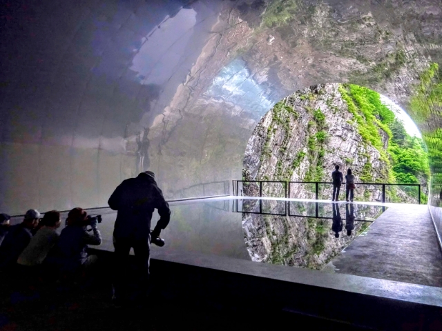半円筒状に反射素材が貼られ、床には水が敷いてあります。上手く光が写り込むと、全方向からのリフレクションが楽しめる仕様となっているのです。トンネルの壁一面に渓谷美が広がる様子は、近未来的なファンタジックさ。