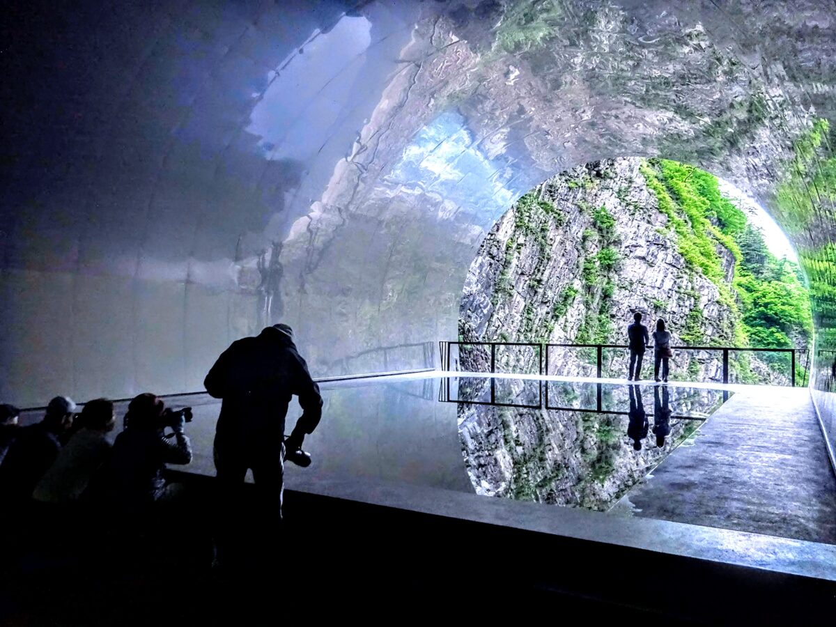 半円筒状に反射素材が貼られ、床には水が敷いてあります。上手く光が写り込むと、全方向からのリフレクションが楽しめる仕様となっているのです。トンネルの壁一面に渓谷美が広がる様子は、近未来的なファンタジックさ。