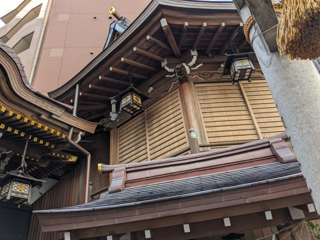 現在の社殿は1929年に再建されたもの。明治神宮造営の工匠長である「内藤駒三郎宮大工一門」によって手掛けられました。日本橋地区では、唯一の戦前木造神社建築なのです。