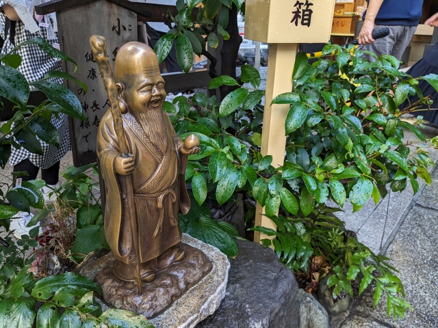 境内には福禄寿像の姿が。人徳・福徳・財徳という三徳の御利益があり、健康長寿の神様として信仰されています。