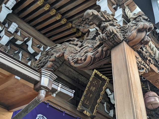 お参りの際に注目したいのが、精巧な彫刻が施された拝殿。総ケヤキ造りの建築は、小規模ながらも重厚な雰囲気。