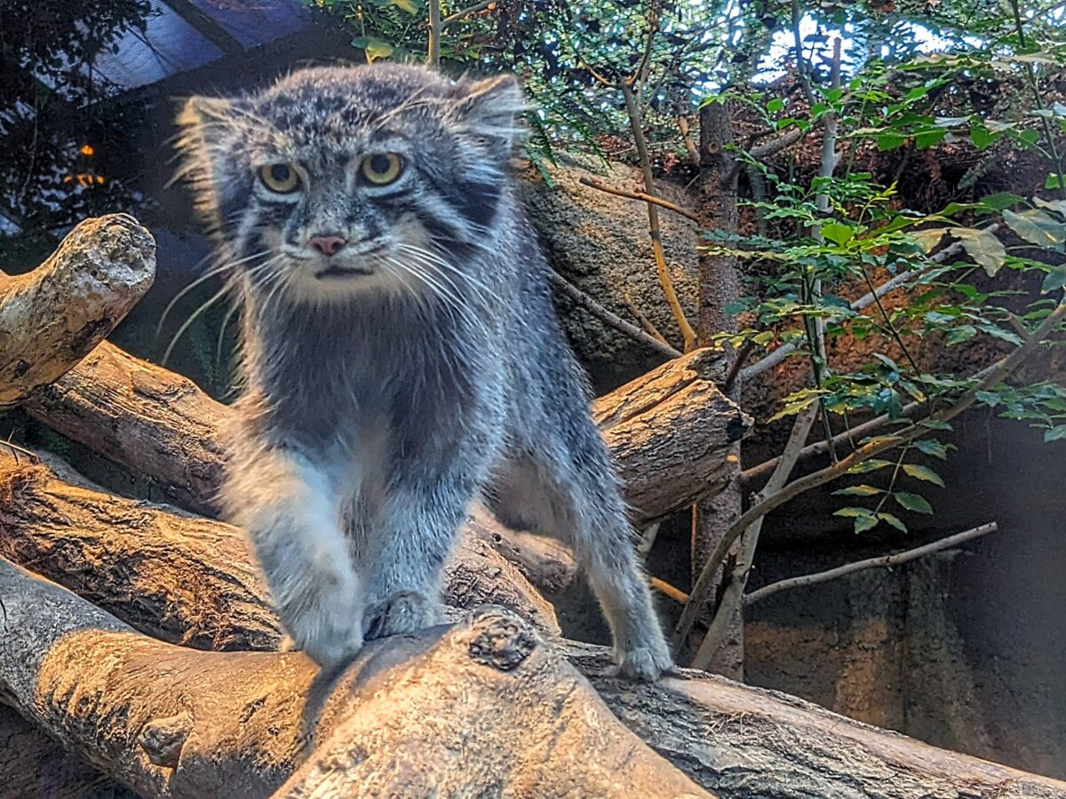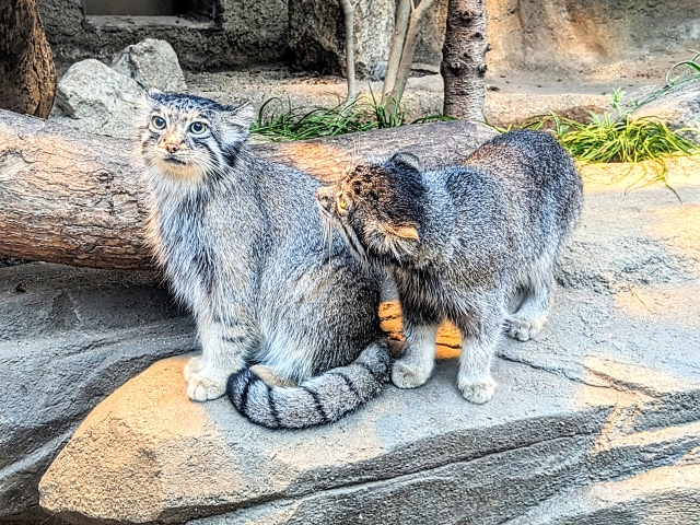 スナネコと並び人気なマヌルネコ。高山などに暮らす野生のネコであるため、毛が長くモフモフとした姿が特徴です。2匹飼育されており、じゃれあったり追いかけたりととっても活発。案内によると、繁殖目的もあるそうです。