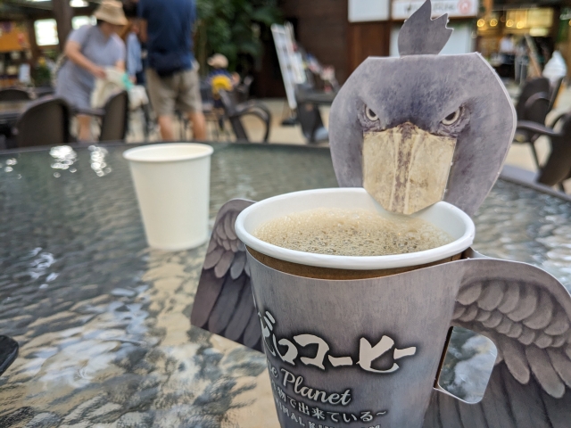 こちらは人気メニューの「ハシビロコーヒー」。ハシビロコウがデザインされたカップホルダーがユニークです。