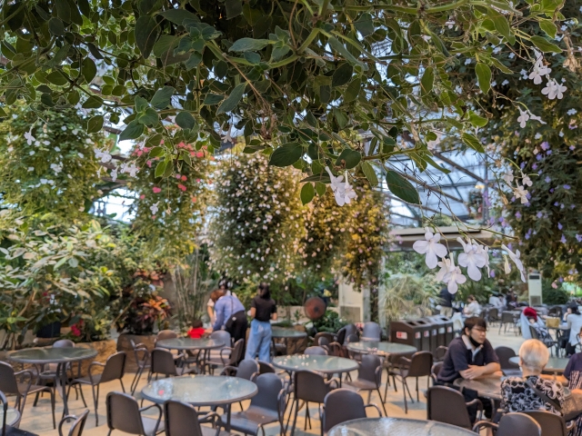 ワンプレートランチなどのメニューがそろったレストラン「花のキッチン」や、ドリンク&軽食の「アルパカフェ」もあるため、昼食をとったり、カフェタイムを過ごすこともできます。