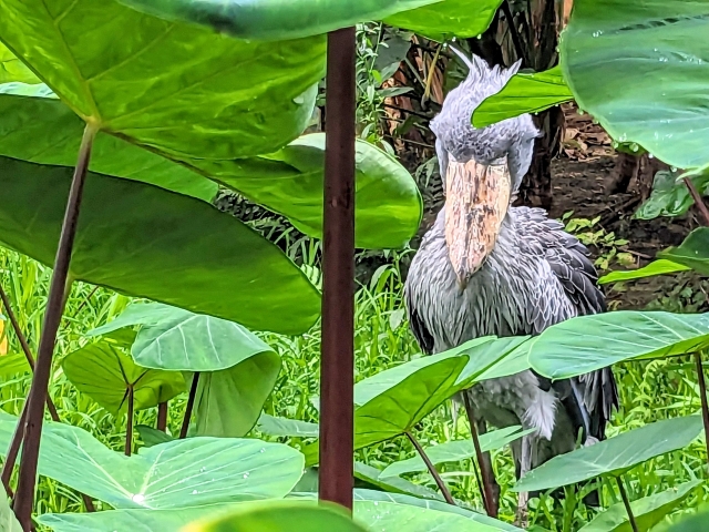 まずは大人気のハシビロコウ。温室内に生い茂る森にいるため、しっかりと探さないと見つからないこともあります。
