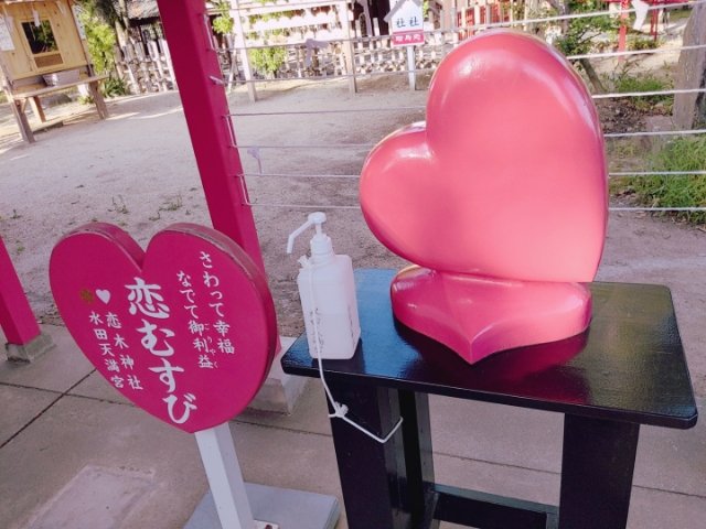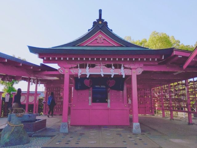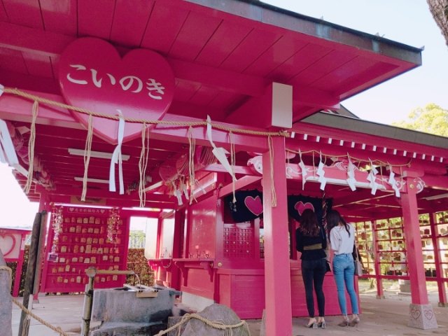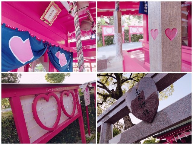 水田天満宮の末社である恋木(こいのき)神社は、恋愛運アップのご利益がある可愛らしい神社。あちこちにあしらわれたハートや、ピンク色のデザインがとにかくファンシー。本社である天満宮への参拝もお忘れなく。