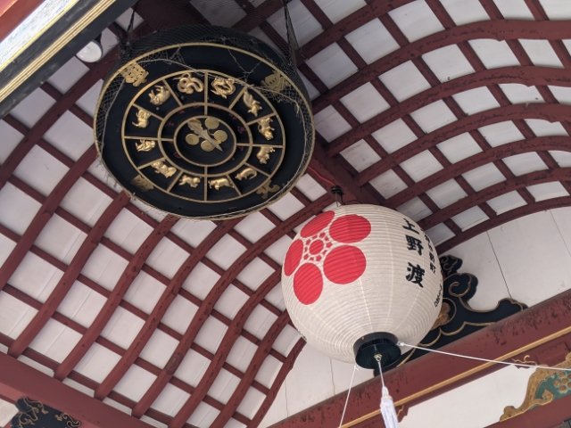 拝殿を見上げると恵方を示す恵方盤を発見しました!金色の干支が描かれているのですが、子、丑、寅、と反時計回りに並んでいます。通常、十二支は時計回りですが、ここでは何か異なる基準があるかもしれません。