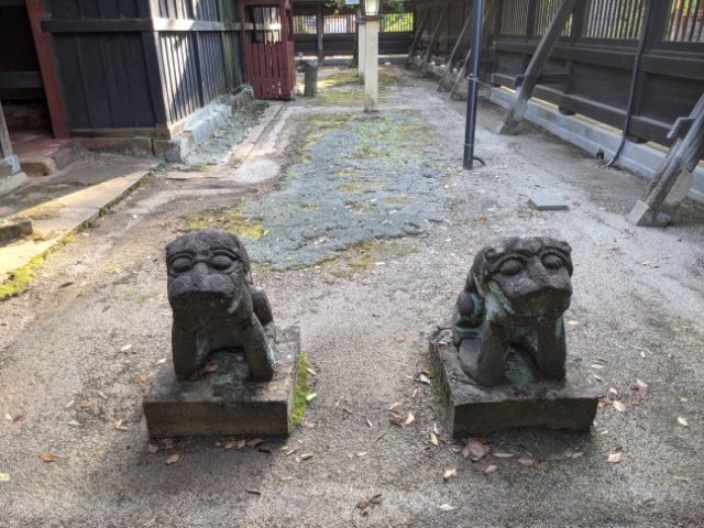 境内には2頭の狛犬が隠れています。なんだか可愛らしいデザインのこの狛犬は、文化財に指定されているそう。拝殿の裏側の玉垣の隙間を覗かないと見ることができないため、気づいている人はほとんどいないのではないかな。