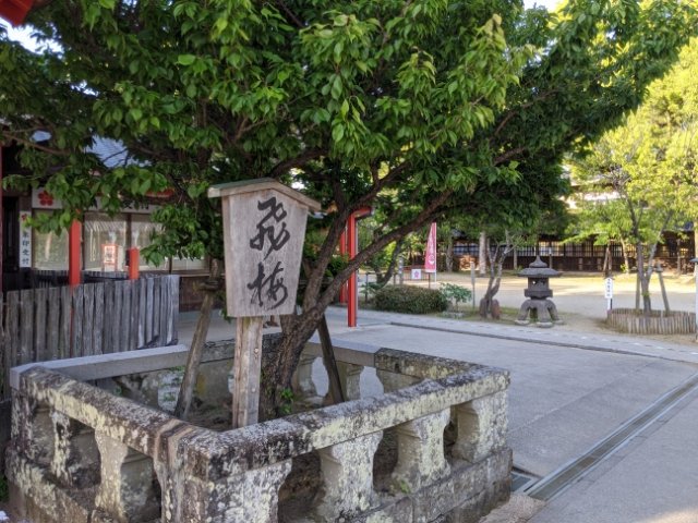 続いて梅の花。道真は梅の花を愛していたため、天満宮には梅の木が植えられています。特にこちらの「飛梅(とびうめ)」にはこのようなストーリーが残っています。「道真が九州へ左遷された際、常日頃寵愛を受けていた梅・松・桜の木は深い悲しみに暮れました。桜はその悲しみで枯れてしまい、松は後を追い飛い立ったものの摂津国で力尽きます。唯一梅だけが九州まで飛ぶことに成功、道真と再会を果たしました」