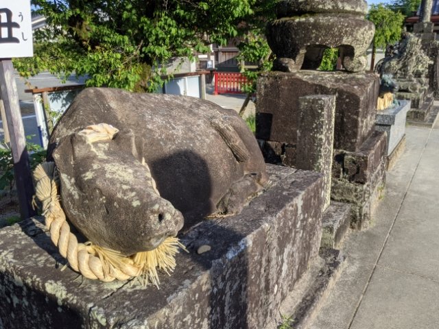 天満宮・天神には共通する特徴があります。まずは撫で牛こと臥牛(がぎゅう)。天満宮と牛のつながりは様々な言われがありますが、ここ水田天満宮のHPに掲載されていたのは、「道真の遺骸を運ぶ際、それを曳いていた牛が途中でうずくまります。ここに留まりたいという道真の遺志に違いないと考えられ、墓所の位置が決まりました」というもの。