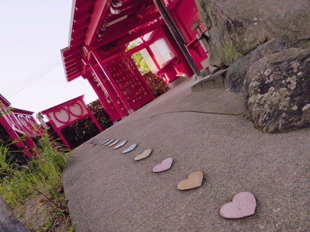 神社の周辺にはハートがたくさん。鳥居や社殿はもちろん、鈴を鳴らすための綱である「鈴緒(すずお)」、拝殿にかけられた「御幕(おまく)」など、様々なところにあしらわれています。随所にデザインされたハート探しをしてみるのも楽しいです!