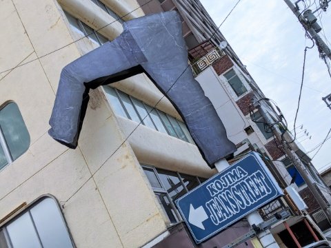 ジーンズストリートには、ジーンズショップ以外にもいろいろなところにジーンズをモチーフにしたアートがあります。