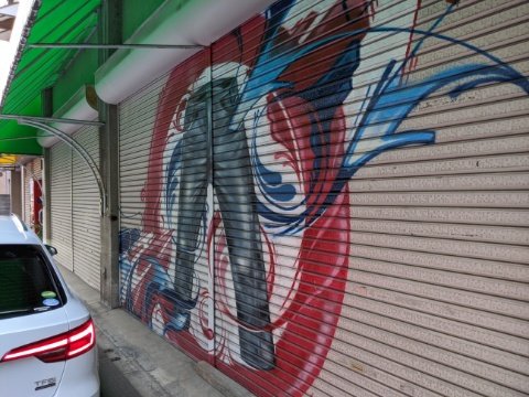 クローズしたお店のシャッターにもジーンズが描かれている。ストリート文化のグラフィックとジーンズは相性抜群。