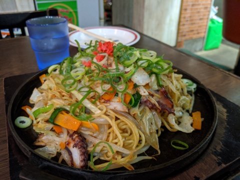 児島といえばジーンズ以外にも「児島たこ塩焼きそば」というご当地グルメも有名。児島名産のタコと塩を組み合わせメニューです。せっかく来たので、食べていくことにしました。