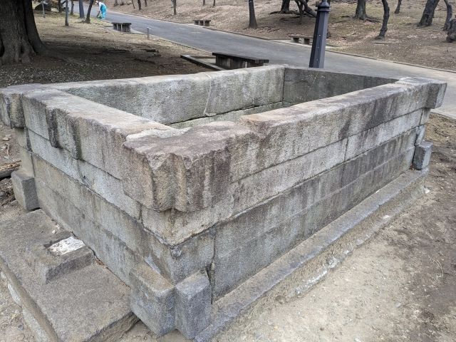 この井戸は、東京都指定旧跡に指定されている「櫻の井」。名水井戸として知られた江戸の名所です。縦約1.8メートル、横約3メートルの石垣で組んだ大きな井戸。三連式釣瓶井戸というタイプの井戸であり、一度に桶3杯の水が汲めていたそうです。