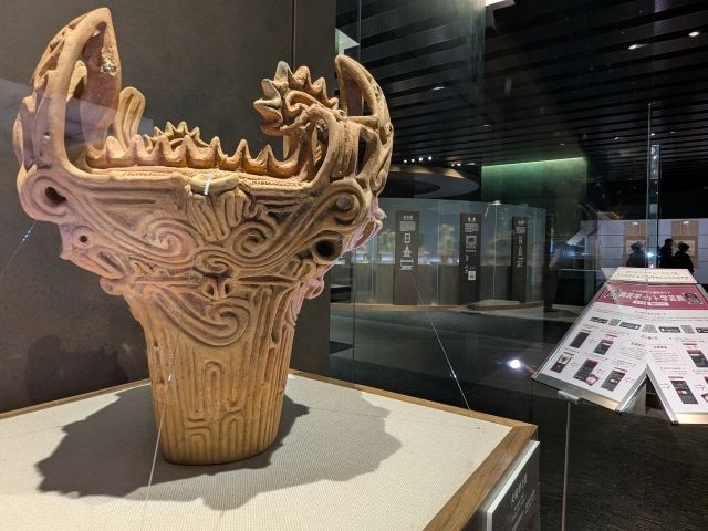 アーティスティックな縄文土器は、新潟県長岡市の岩野原遺跡より出土した火焔型土器。縄文土器らしい力強さが詰まっています。