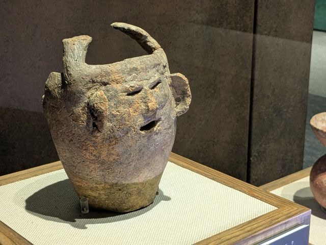 顔がついたユニークな器は、長野県長野市の片山遺跡より出土した挙手人面土器。ツノのように見える部分は、よくみると手のひら!手を上げているような姿をしています。