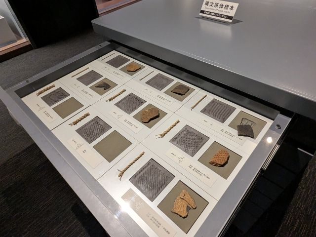 ユニークなのが引き出しを引くと出てくる縄文原体標本。縄文土器は縄で模様をつける、というのはよく知られていますが、実物の縄とそれでできる模様、そしてそれが使用された土器片が合わせて展示されています。地域毎に分かれた展示は、なんと100種類以上!こんなにパターンがあるなんてびっくりです。