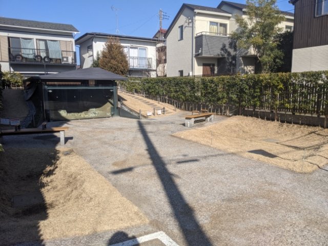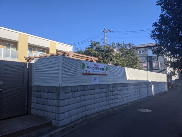この目隠しフェンスはかなり高さがあるため、内部は全く見えません。もちろんわずかな隙間などもありません。「どこか隙間くらいあるでしょう」と、周囲をぐるっとまわってみたのですが園内を覗けるポイントは皆無。完璧すぎるプライバシー設定です。(保育園のまわりをうろうろするなんて完全に通報案件ですが、本日保育園はお休みで人の気配はなかったので許してください)