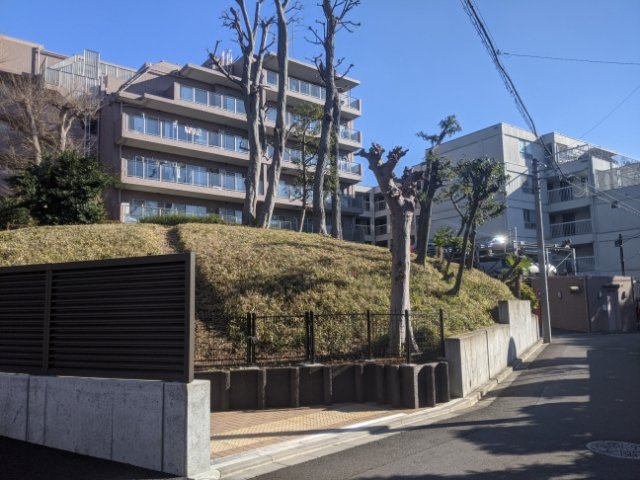 マンションの敷地内、手前に見える小さな山が土屋塚古墳。ちゃんと墳丘が残されており、草木の手入れもされている姿を見て一安心。