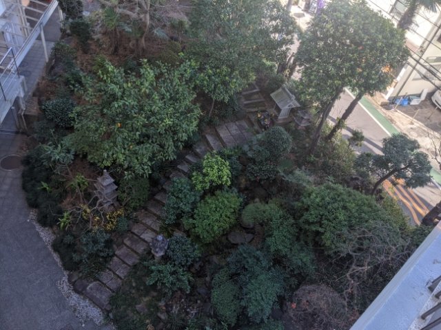 もう少し違う角度から見たいと思い、エレベーターで上のフロアへ進んでみたところ、窓から古墳の全貌がばっちり見えます!石段や石灯籠、祠が設置されており、きちんと整備されている様子。生えている植物も手入れされています。