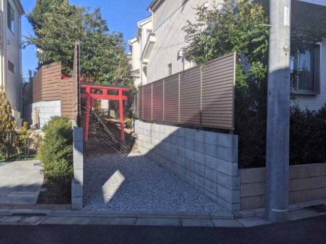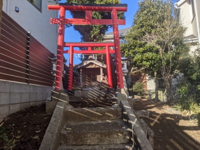 ローソン狛江中和泉三丁目店の脇の細い道を進んでいくと、民家と民家の隙間に赤い鳥居が見えます。
