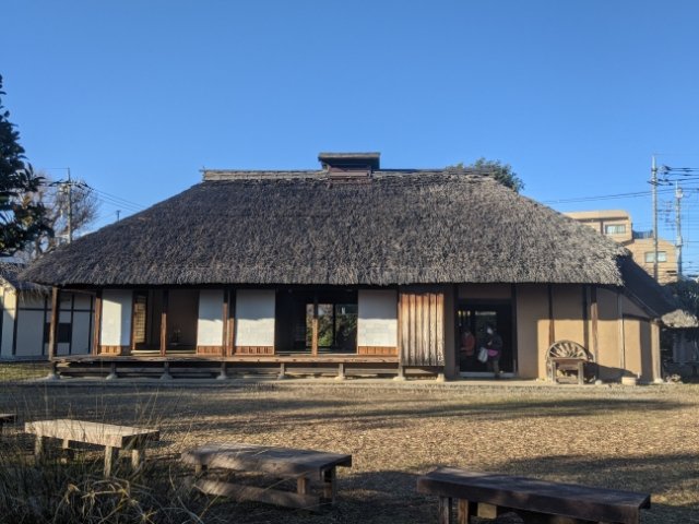 ここには旧新井家住宅主屋と旧高木家長屋門の二棟が移築されています。堂々と佇む茅葺きの民家は雰囲気抜群!小田急線の立体交差および複々線化にともない解体されましたが、この地に移築・保存されたそうです。