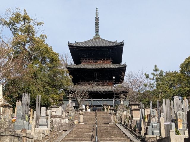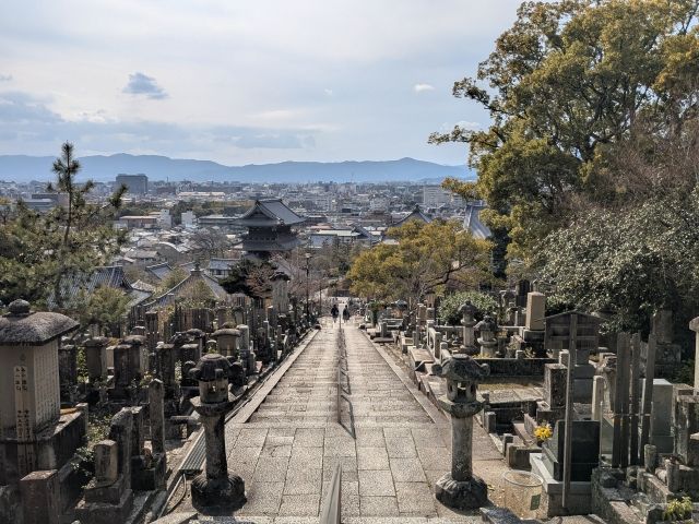 この金戒光明寺は高台に建つ寺院。さらに三重塔は石段を上った先にあるため眺めが抜群!岡崎エリアを広く見渡せます。