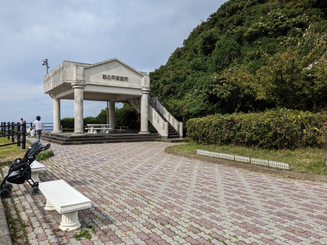 駐車場から道路を渡るとギリシャ神殿のような展望台が見えてきました。