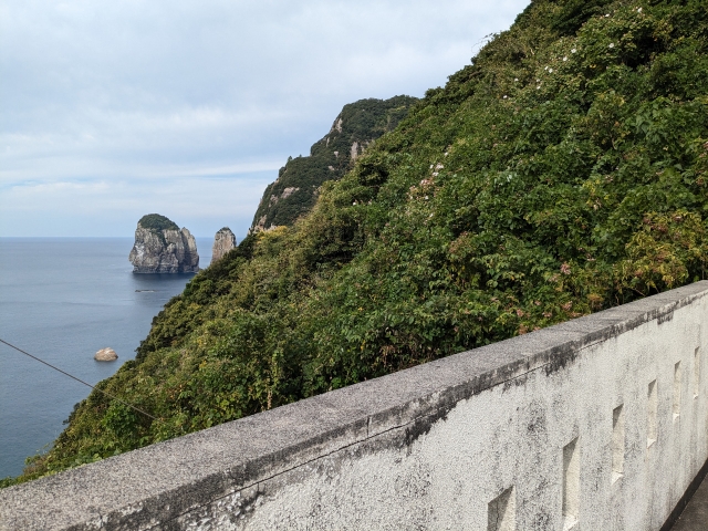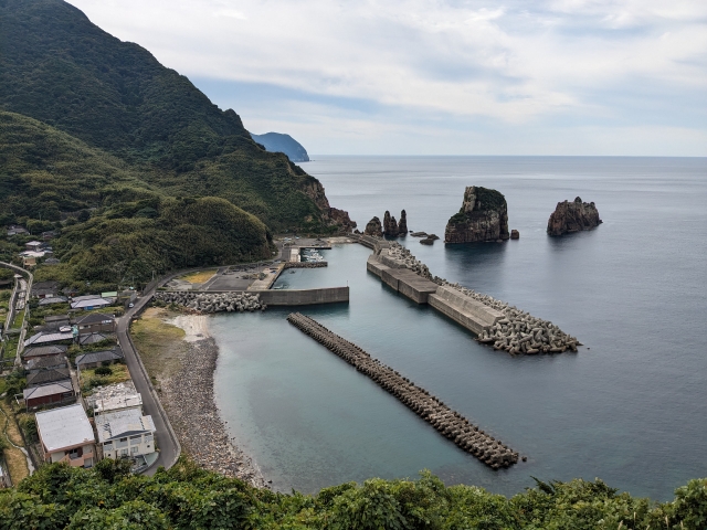 前の平展望所からは瀬々野浦の集落も見渡せます。港付近には奇岩がたくさん。せっかくここまで来たので、集落まで降りてみることにしました。