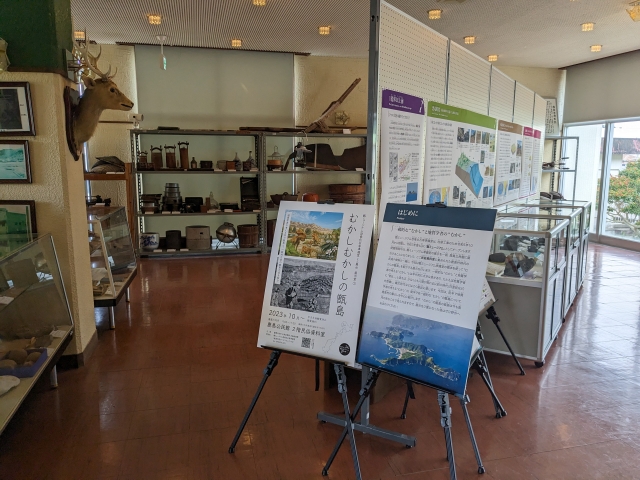 2階の展示室①では「むかしむかしの甑島」という展示が。一般人が考えるむかしと地質学者のむかしを比較した展示で、一般人は民俗資料と合わせて旧石器時代から、地質学者は1億年以上前からと比較されていました。