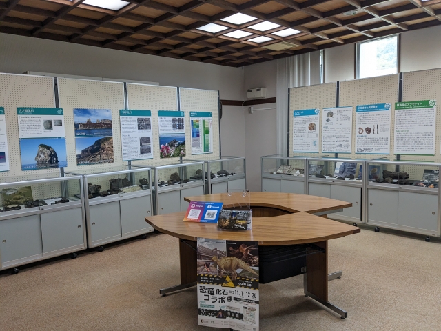 1階の展示室②は甑島で見つかった化石の展示。巨大な恐竜の骨格標本などはありませんが、アンモナイト、サメの歯、ウミユリ、モササウルス亜科の歯などを見ることができます。