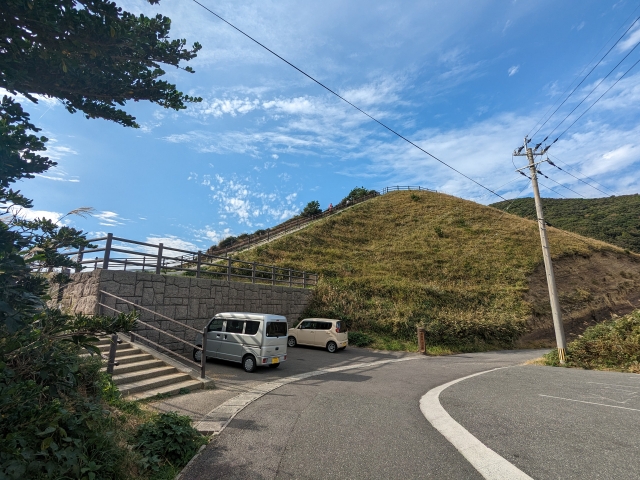 下甑島の北端である鹿島地区にある、断崖の地層が楽しめる展望台が夜萩円山公園。駐車スペースが数台分、トイレや自販機はありません。