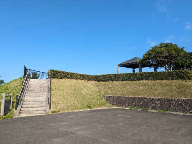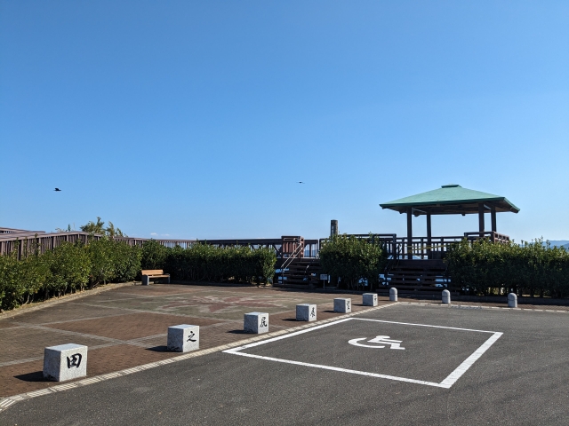 長目の浜展望所のすぐそばにある展望所で、「ふれあいパーク鍬崎」とも記されています。ここは屋根付きの椅子とトイレもあるので、ひと休みにも良さそうです。
