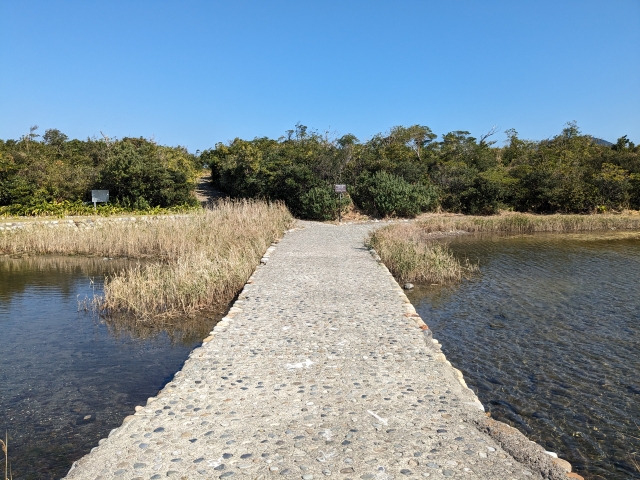 長目の浜展望所から降りることもできますが、少々体力が必要になります。最も気軽に長目の浜を歩くことができるのが、こちらの「なまこ池と貝池の間のポイント」。
