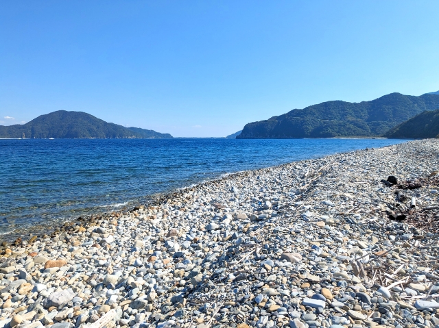 少しだけ植物がしげる道を抜けると、見えてくるのは青い海と長目の浜。展望所から見た際は白砂に見えていましたが、実は全て丸い石でできています。砂浜に比べると少々歩きにくいですが、波打ち際を散策すると、様々な漂流物を見ることができます。