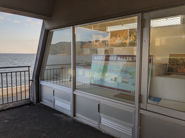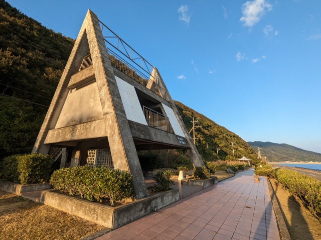 甑島大明神橋の手前に建つ三角形の不思議な建物。こちらは展望所資料館。