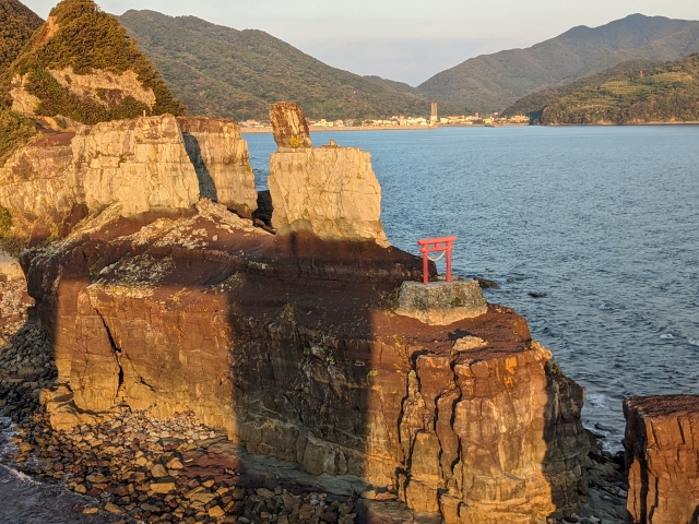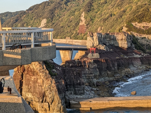途中には、テラスの様なちょっとした展望スペースがあります。その先に見える赤い鳥居、これこそがこの橋の名前の由来であり、さらに甑島の島名の由来でもある「甑大明神」です。