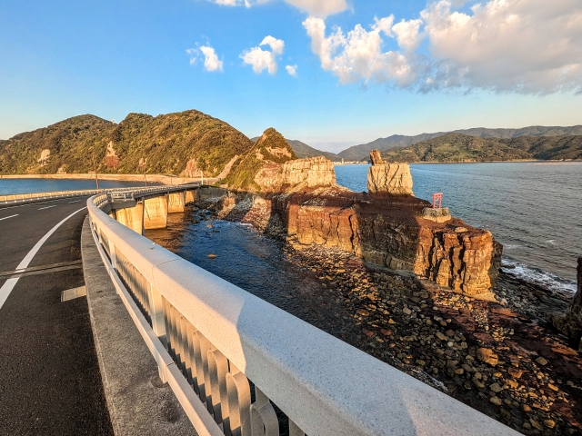3つの有人島が連なる甑島列島。その間には3つの橋が架けられています。上甑島から「甑大明神橋」を渡り無人島の中島を経由、「鹿の子大橋」を渡り中甑島、さらに2020年完成の「甑大橋」を渡って下甑島へ。車で島巡りしながら本日の宿へと向かいます。