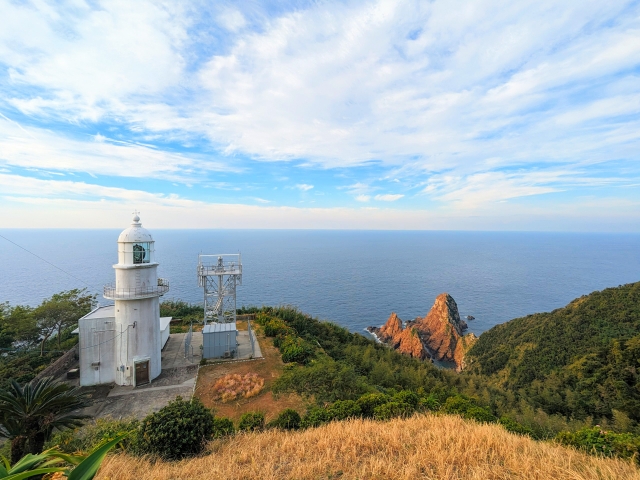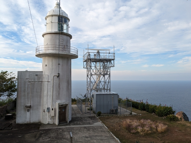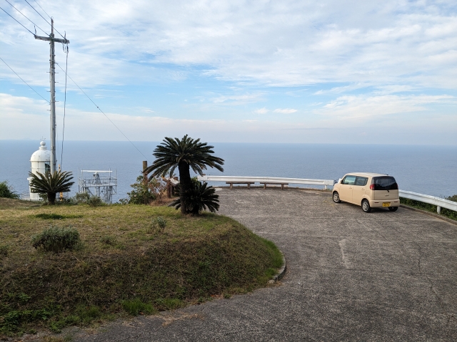 下甑島の最南端にそびえる灯台、釣掛崎灯台。手打集落から約3km、長い下り坂をおりていくと駐車スペースとベンチ、案内板があります。