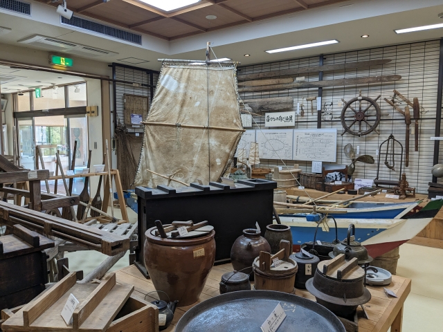 1階は小型木造和船や漁業に使用する様々な道具、農業の道具などが展示されています。