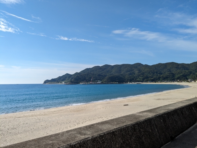 弧を描くビーチ「手打浜」沿いに家々が広がっています。以前はキビナゴの地引き網が行われており、さらには100頭以上のウミガメが産卵のために上陸する姿を見ることができたそう。現在は防波堤が設置され、その結果どちらも見ることはできなくなってしまったとのことです。
