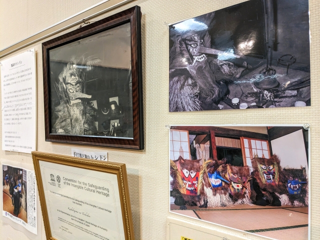 内容が濃いのが2階の展示。この写真に写っているのはトシドン。大晦日に子供のいる家々を訪れる仮面の神様です。子どもたちに説教を行い、「良い子になります」と答えると背中に大きなお餅を乗せてくれます。歳をくれる神様でもあるそう。2009年には「甑島のトシドン」としてユネスコ無形文化遺産にも登録、2018年には「男鹿のナマハゲ」や「悪石島のボゼ」とともに「来訪神:仮面・仮装の神々」というカタチで登録されています。