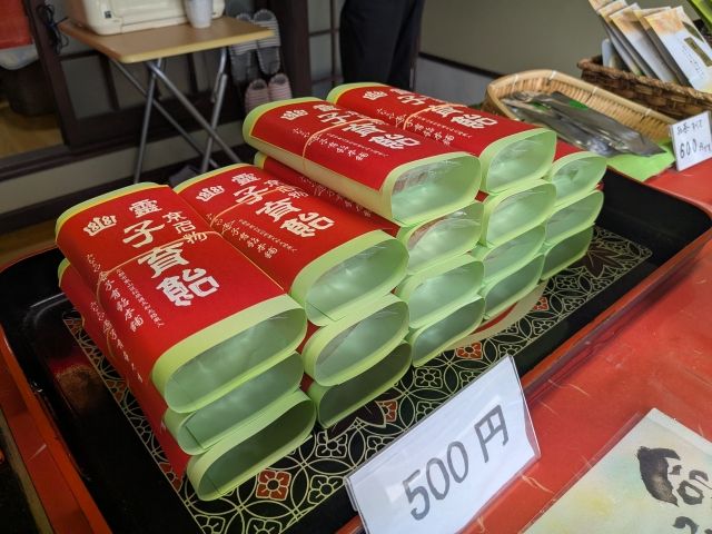 幽霊子育飴は150gが500円。真っ赤な紙に包まれて積まれています。試食もできるので、味が気になる方は一度試してみるのもおすすめ。