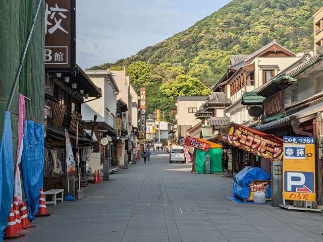 うどん屋さんや旅館、屋台が立ち並ぶ参道。まだお店はオープンしてませんがGWということもあり歩いている人はけっこういます。