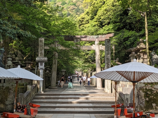 おすすめの持ち物はなんといっても「日傘」!!特に御本宮までは日当たり抜群な石の道が続くので、これがあるだけで体力を温存できます。